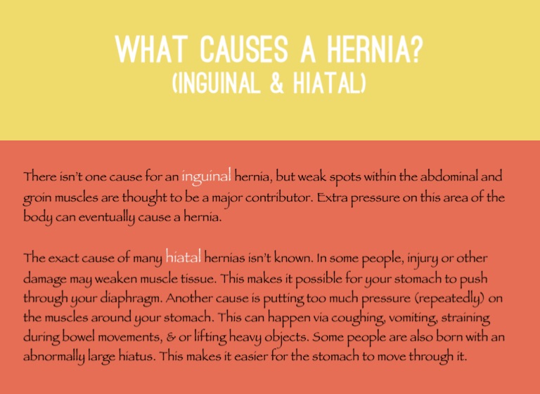 The exact cause of many hiatal hernias isn’t known. In some people, injury or other damage may weaken muscle tissue. This makes it possible for your stomach to push through your diaphragm. Another cause is putting too much pressure (repeatedly) on the muscles around your stomach. This can happen via coughing, vomiting, straining during bowel movements, & or lifting heavy objects. Some people are also born with an abnormally large hiatus. This makes it easier for the stomach to move through it.