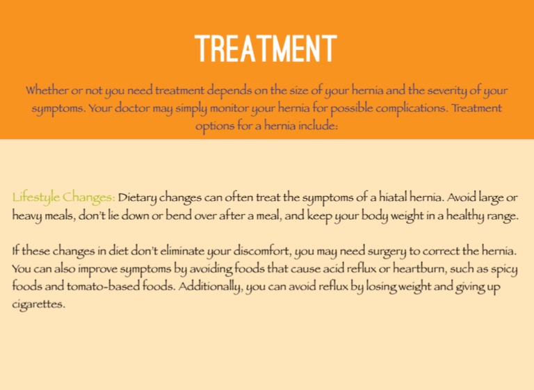 Lifestyle Changes: Dietary changes can often treat the symptoms of a hiatal hernia. Avoid large or heavy meals, don’t lie down or bend over after a meal, and keep your body weight in a healthy range.