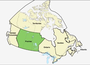 The Prairie Region of Canada is is a 2,000 km valley full of plains, forests and farmland. The climate changes between warm, dry sunny days and cold nights.