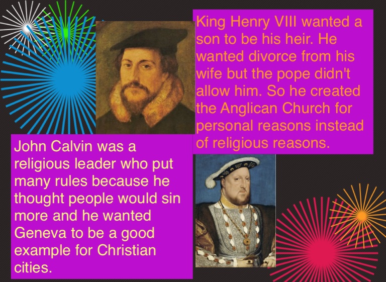 King Henry VIII wanted a son to be his heir. He wanted divorce from his wife but the pope didn't allow him. So he created the Anglican Church for personal reasons instead of religious reasons.