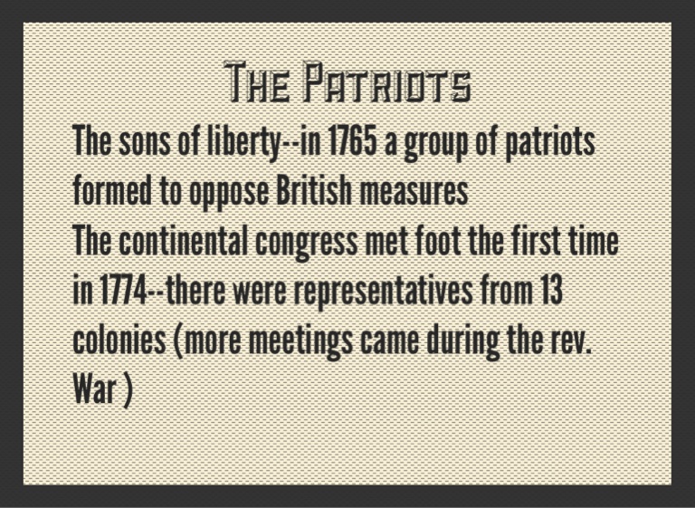 The sons of liberty--in 1765 a group of patriots formed to oppose British measures