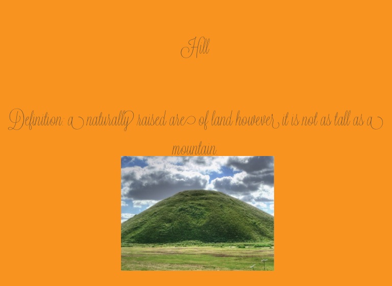 Definition: a naturally raised are of land however it is not as tall as a mountain.