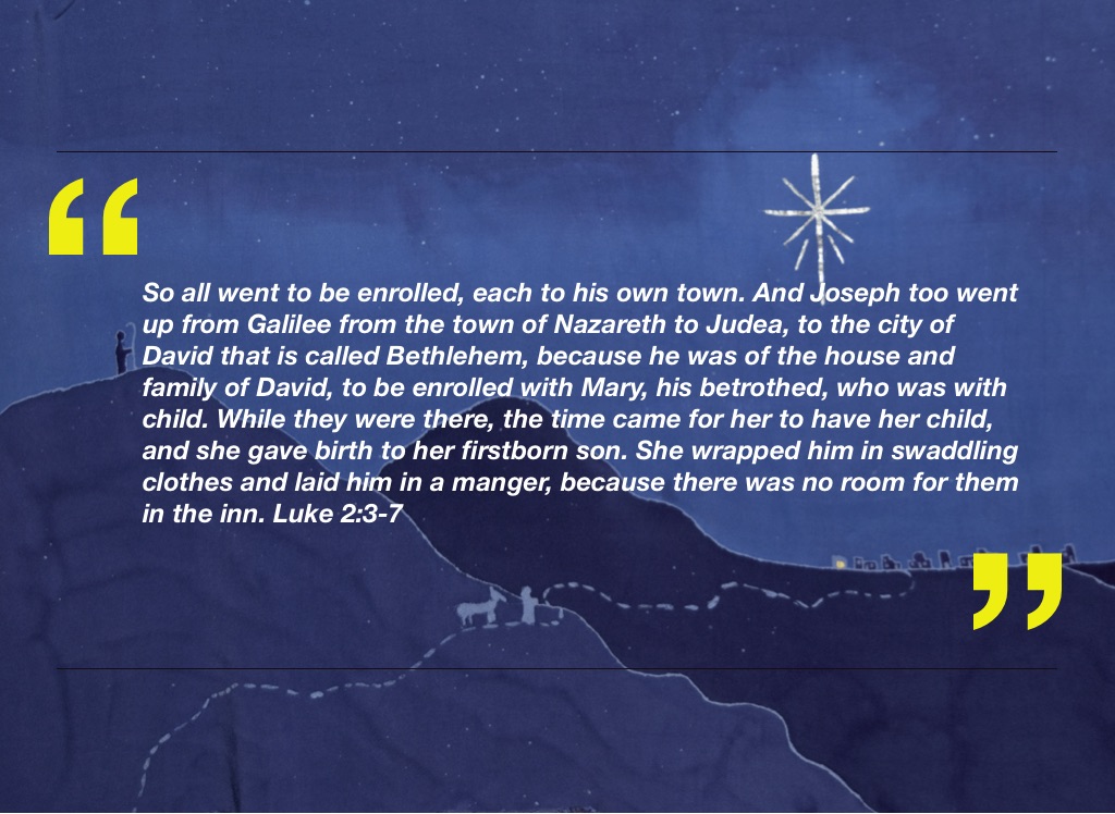 So all went to be enrolled, each to his own town. And Joseph too went up from Galilee from the town of Nazareth to Judea, to the city of David that is called Bethlehem, because he was of the house and family of David, to be enrolled with Mary, his betrothed, who was with child. While they were there, the time came for her to have her child, and she gave birth to her firstborn son. She wrapped him in swaddling clothes and laid him in a manger, because there was no room for them in the inn. Luke 2:3-7
