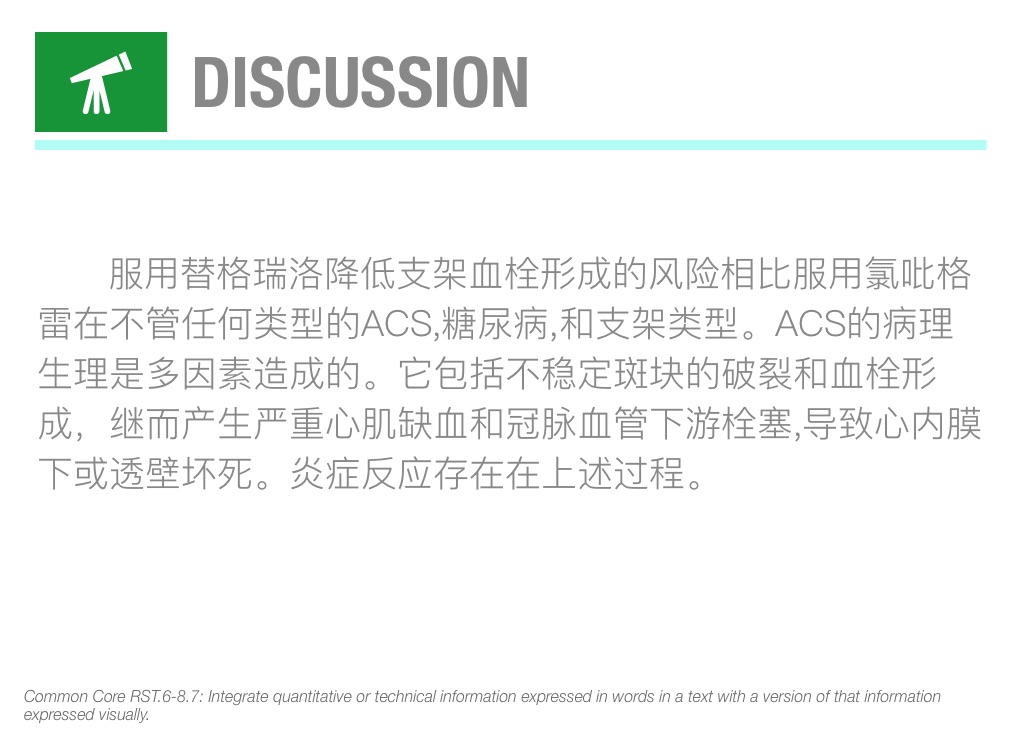 服用替格瑞洛降低支架血栓形成的风险相比服用氯吡格雷在不管任何类型的ACS,糖尿病,和支架类型。ACS的病理生理是多因素造成的。它包括不稳定斑块的破裂和血栓形成,继而产生严重心肌缺血和冠脉血管下游栓塞,导致心内膜下或透壁坏死。炎症反应存在在上述过程。