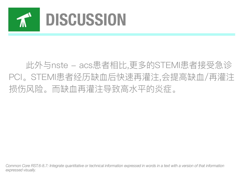 此外与nste - acs患者相比,更多的STEMI患者接受急诊PCI。STEMI患者经历缺血后快速再灌注,会提高缺血/再灌注损伤风险。而缺血再灌注导致高水平的炎症。