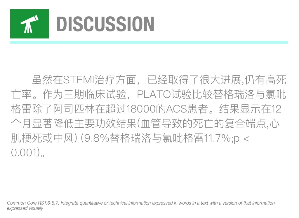 虽然在STEMI治疗方面,已经取得了很大进展,仍有高死亡率。作为三期临床试验,PLATO试验比较替格瑞洛与氯吡格雷除了阿司匹林在超过18000的ACS患者。结果显示在12个月显著降低主要功效结果(血管导致的死亡的复合端点,心肌梗死或中风) (9.8%替格瑞洛与氯吡格雷11.7%;p < 0.001)。