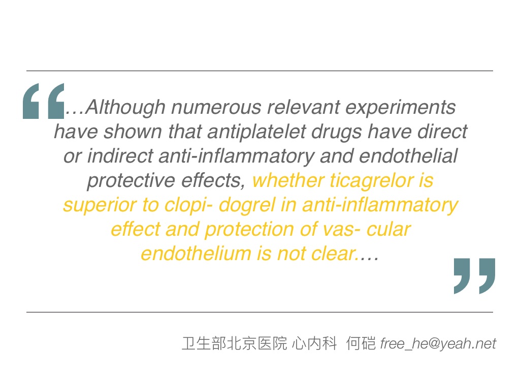 …Although numerous relevant experiments have shown that antiplatelet drugs have direct or indirect anti-inflammatory and endothelial protective effects, whether ticagrelor is superior to clopi- dogrel in anti-inflammatory effect and protection of vas- cular endothelium is not clear.…