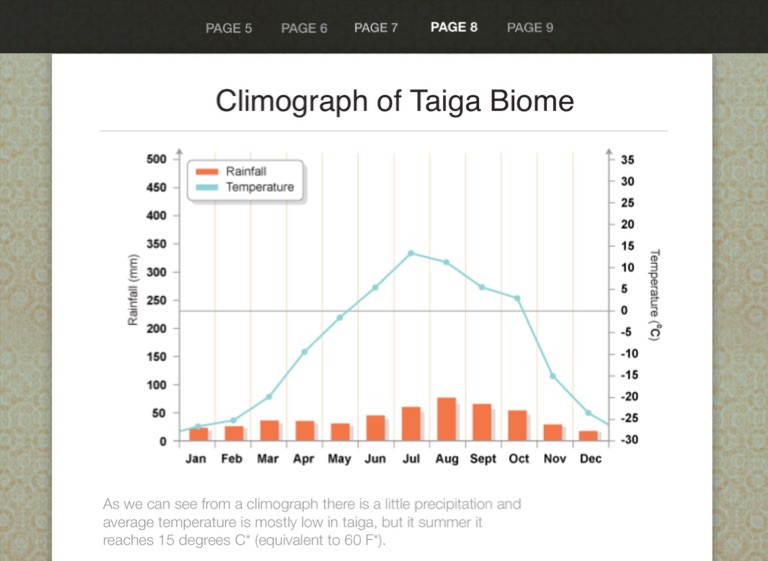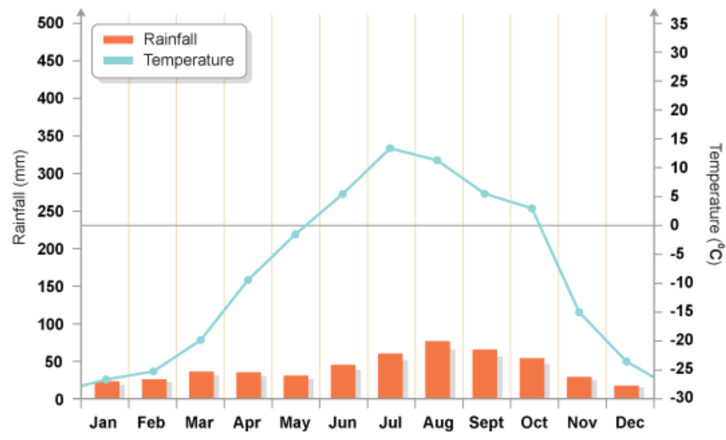 As we can see from a climograph there is a little precipitation and average temperature is mostly low in taiga, but it summer it reaches 15 degrees C* (equivalent to 60 F*).