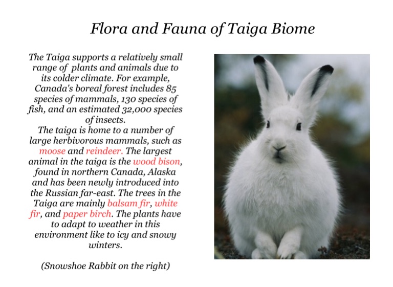 The taiga is home to a number of large herbivorous mammals, such as moose and reindeer. The largest animal in the taiga is the wood bison, found in northern Canada, Alaska and has been newly introduced into the Russian far-east. The trees in the Taiga are mainly balsam fir, white fir, and paper birch. The plants have to adapt to weather in this environment like to icy and snowy winters.