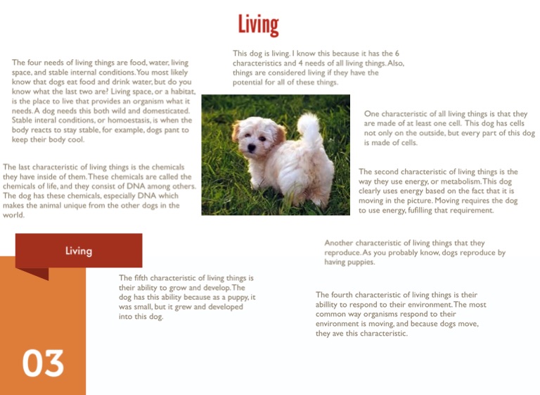 The last characteristic of living things is the chemicals they have inside of them. These chemicals are called the chemicals of life, and they consist of DNA among others. The dog has these chemicals, especially DNA which makes the animal unique from the other dogs in the world.