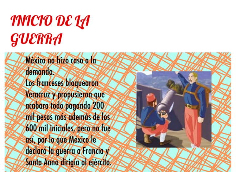 Los franceses bloquearon Veracruz y propusieron que acabara todo pagando 200 mil pesos más además de los 600 mil iniciales, pero no fue así, por lo que México le declaró la guerra a Francia y Santa Anna dirigía al ejército.
