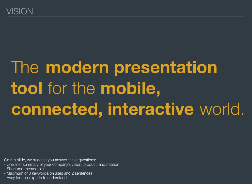 - One liner summary of your company’s vision, product, and mission