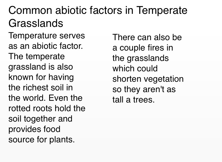Temperature serves as an abiotic factor. The temperate grassland is also known for having the richest soil in the world. Even the rotted roots hold the soil together and provides food source for plants.