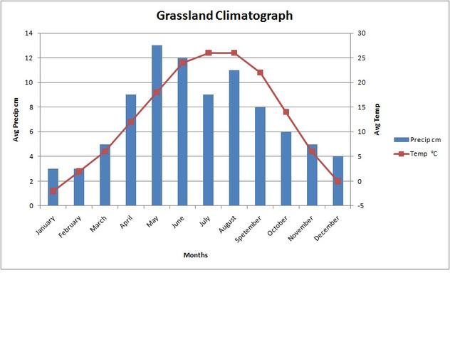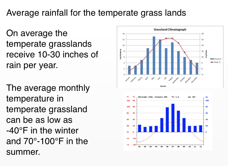 The average monthly temperature in temperate grassland can be as low as -40°F in the winter and 70°-100°F in the summer.