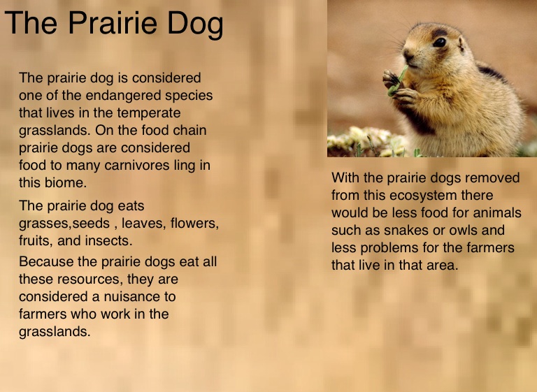 The prairie dog is considered one of the endangered species that lives in the temperate grasslands. On the food chain prairie dogs are considered food to many carnivores ling in this biome.