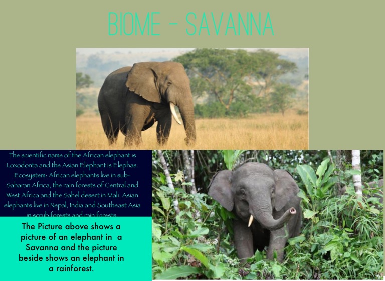 The Picture above shows a picture of an elephant in a Savanna and the picture beside shows an elephant in a rainforest.