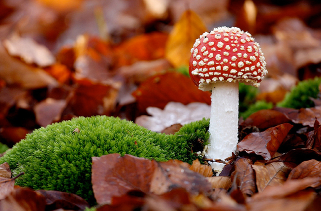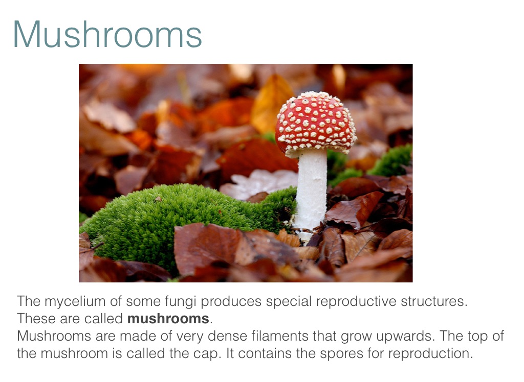 Mushrooms are made of very dense filaments that grow upwards. The top of the mushroom is called the cap. It contains the spores for reproduction.