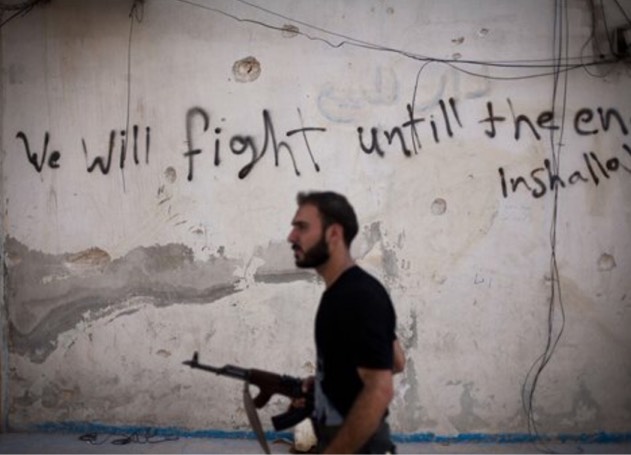 Fundamentalist governments have control in many areas. The Middle East is full of countries controlled by extremists. This image displays a Free Syrian Army fighter patrolling the streets of Syria. Many governments in the Middle East are weak, making them targets to extremist groups. This picture was taken September 10, 2012. The setting is the streets of the Amariya district in Aleppo, Syria. The fundamentalists wish to take charge of their countries to ensure that the rules of their religions are obeyed and respected. Extremist groups often form militias to cripple the already weak governments. These fundamentalists are usually extremely strict with matters concerning their religion and are quick to resort to violence. This is similar to Persepolis because civilians were often scared to speak out against the extremists.