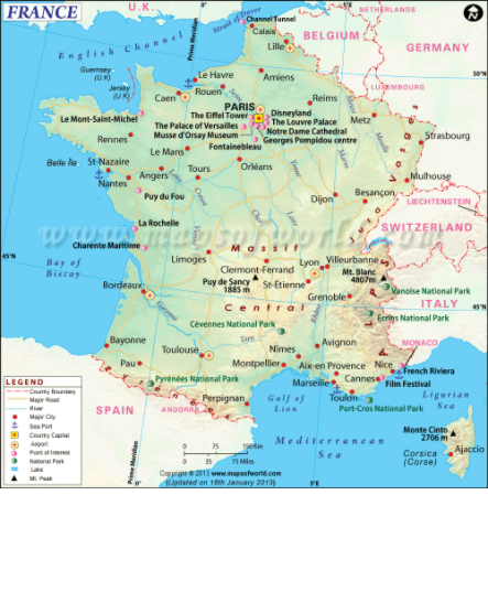 France is located in Western Europe. Surrounded by the Atlantic Ocean and the Mediterranean.