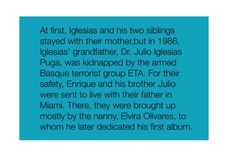 At first, Iglesias and his two siblings stayed with their mother,but in 1986, Iglesias' grandfather, Dr. Julio Iglesias Puga, was kidnapped by the armed Basque terrorist group ETA. For their safety, Enrique and his brother Julio were sent to live with their father in Miami. There, they were brought up mostly by the nanny, Elvira Olivares, to whom he later dedicated his first album.