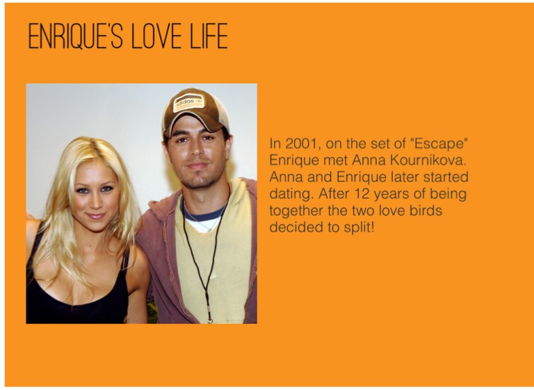 In 2001, on the set of "Escape" Enrique met Anna Kournikova. Anna and Enrique later started dating. After 12 years of being together the two love birds decided to split!