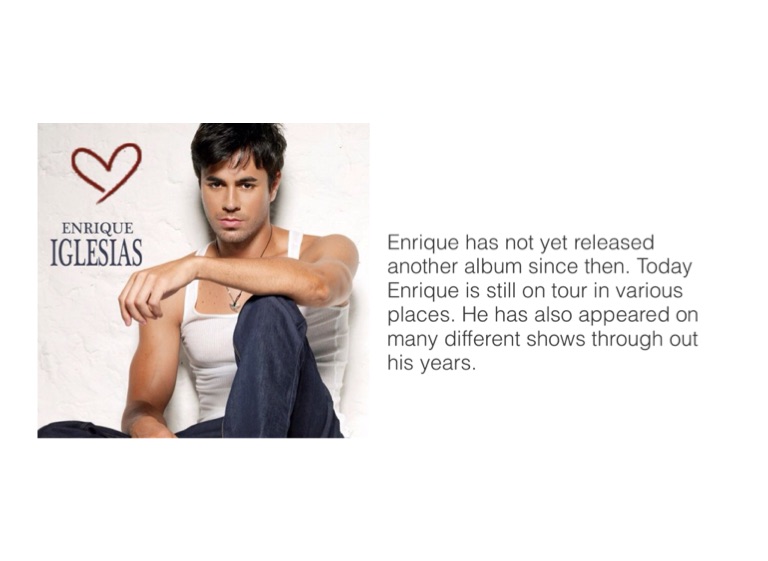 Enrique has not yet released another album since then. Today Enrique is still on tour in various places. He has also appeared on many different shows through out his years.