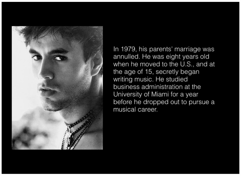 In 1979, his parents' marriage was annulled. He was eight years old when he moved to the U.S., and at the age of 15, secretly began writing music. He studied business administration at the University of Miami for a year before he dropped out to pursue a musical career.