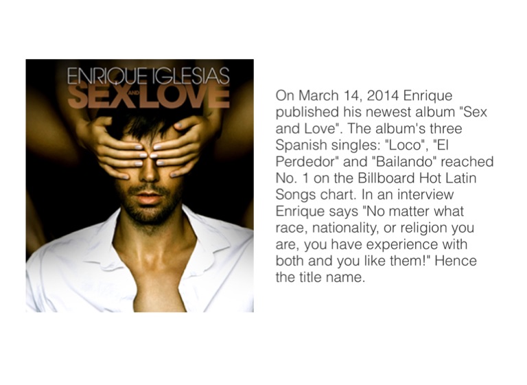 On March 14, 2014 Enrique published his newest album "Sex and Love". The album's three Spanish singles: "Loco", "El Perdedor" and "Bailando" reached No. 1 on the Billboard Hot Latin Songs chart. In an interview Enrique says "No matter what race, nationality, or religion you are, you have experience with both and you like them!" Hence the title name.