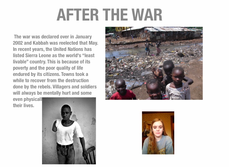 The war was declared over in January 2002 and Kabbah was reelected that May. In recent years, the United Nations has listed Sierra Leone as the world's “least livable” country. This is because of its poverty and the poor quality of life endured by its citizens. Towns took a while to recover from the destruction done by the rebels. Villagers and soldiers will always be mentally hurt and some even physically damaged for the rest of their lives.