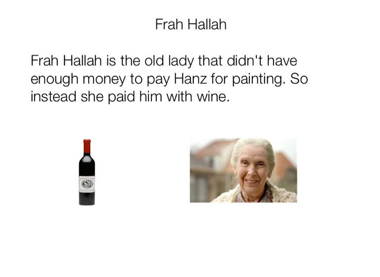 Frah Hallah is the old lady that didn't have enough money to pay Hanz for painting. So instead she paid him with wine.