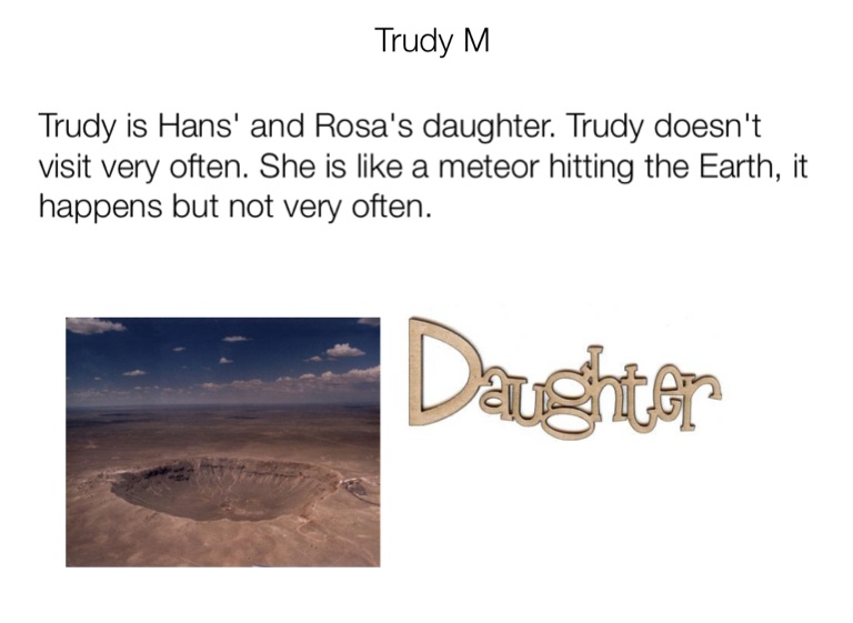 Trudy is Hans' and Rosa's daughter. Trudy doesn't visit very often. She is like a meteor hitting the Earth, it happens but not very often.