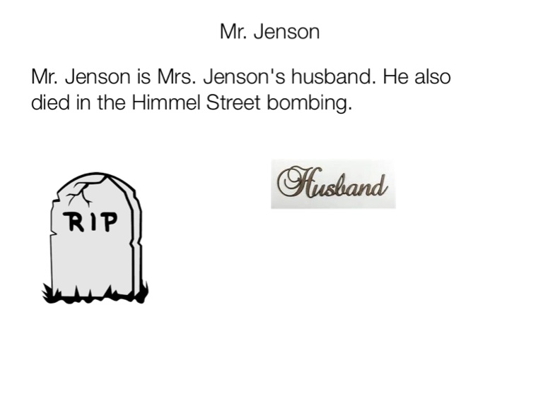 Mr. Jenson is Mrs. Jenson's husband. He also died in the Himmel Street bombing.
