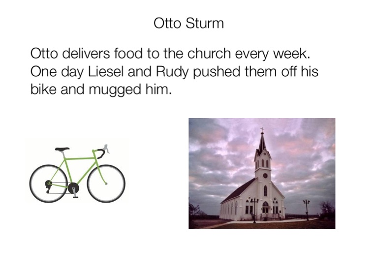 Otto delivers food to the church every week. One day Liesel and Rudy pushed them off his bike and mugged him.