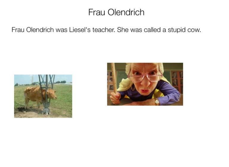 Frau Olendrich was Liesel's teacher. She was called a stupid cow.