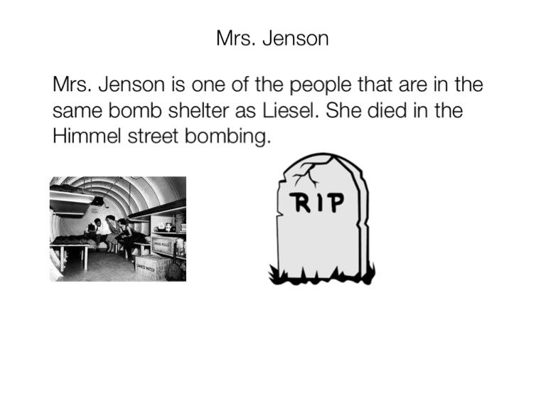 Mrs. Jenson is one of the people that are in the same bomb shelter as Liesel. She died in the Himmel street bombing.