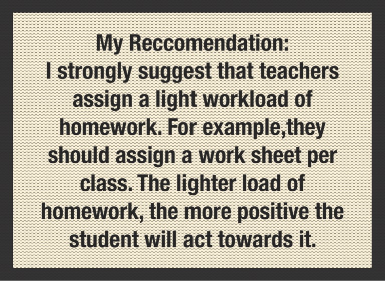 I strongly suggest that teachers assign a light workload of homework. For example,they should assign a work sheet per class. The lighter load of homework, the more positive the student will act towards it.