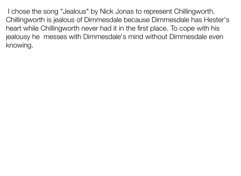 I chose the song "Jealous" by Nick Jonas to represent Chillingworth. Chillingworth is jealous of Dimmesdale because Dimmesdale has Hester's heart while Chillingworth never had it in the first place. To cope with his jealousy he messes with Dimmesdale's mind without Dimmesdale even knowing.