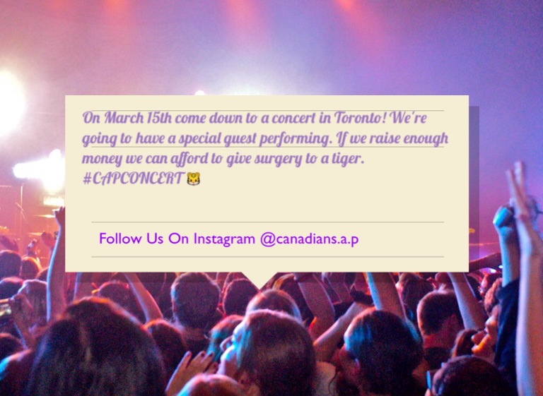 On March 15th come down to a concert in Toronto! We're going to have a special guest performing. If we raise enough money we can afford to give surgery to a tiger. #CAPCONCERT 🐯