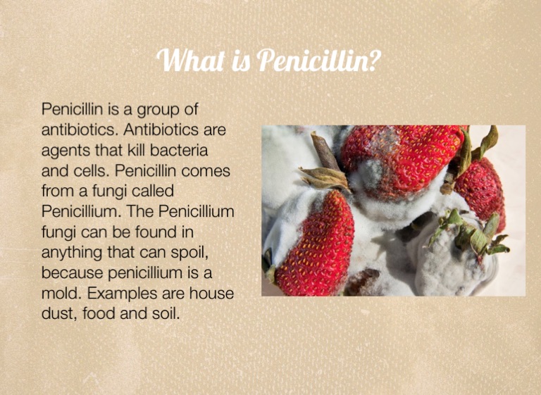 Penicillin is a group of antibiotics. Antibiotics are agents that kill bacteria and cells. Penicillin comes from a fungi called Penicillium. The Penicillium fungi can be found in anything that can spoil, because penicillium is a mold. Examples are house dust, food and soil.