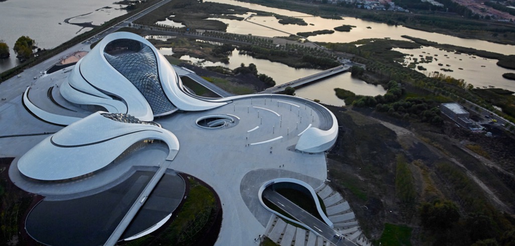 of Harbin, featuring an undulating form that wraps two concert halls and a huge public plaza.