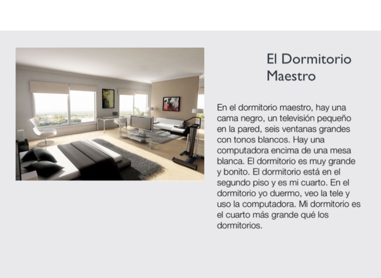En el dormitorio maestro, hay una cama negro, un televisión pequeño en la pared, seis ventanas grandes con tonos blancos. Hay una computadora encima de una mesa blanca. El dormitorio es muy grande y bonito. El dormitorio está en el segundo piso y es mi cuarto. En el dormitorio yo duermo, veo la tele y uso la computadora. Mi dormitorio es el cuarto más grande qué los dormitorios.