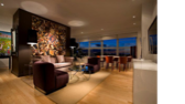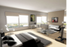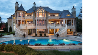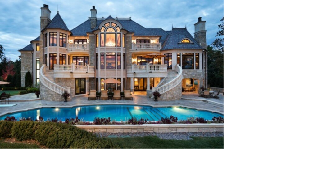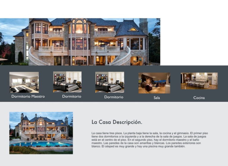 La casa tiene tres pisos. La planta baja tiene la sala, la cocina y el gimnasio. El primer piso tiene dos dormitorios a la izquierda y a la derecha de la sala de juegos. La sala de juegos está en el centro de el piso. En el segundo piso, hay el dormitorio maestro y el baño maestro. Las paredes de la casa son amarillas y blancas. Los paredes exteriores son blanco. El césped es muy grande y hay una piscina muy grande también.