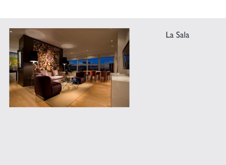 La sala está en la planta baja, a la izquierda de la cocina. La sala es el más grande cuarto de la casa. En la sala hay muchas sillas marrones, dos mesas y dos carteles muy grandes. También hay una alfombra muy bonita, un estante al lado de las sillas y dos lamparas al lado de la silla. En la sala yo pongo la mesa, leo, y hablo can amigos.