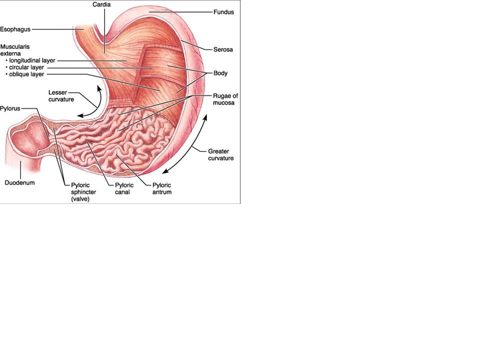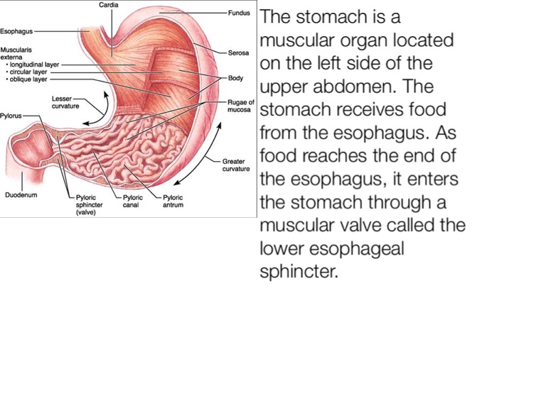 The stomach is a muscular organ located on the left side of the upper abdomen. The stomach receives food from the esophagus. As food reaches the end of the esophagus, it enters the stomach through a muscular valve called the lower esophageal sphincter.