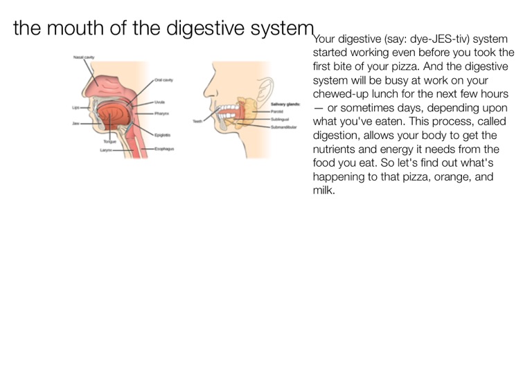 Your digestive (say: dye-JES-tiv) system started working even before you took the first bite of your pizza. And the digestive system will be busy at work on your chewed-up lunch for the next few hours — or sometimes days, depending upon what you've eaten. This process, called digestion, allows your body to get the nutrients and energy it needs from the food you eat. So let's find out what's happening to that pizza, orange, and milk.