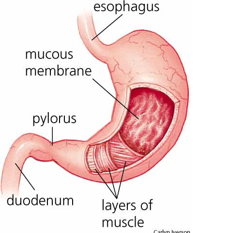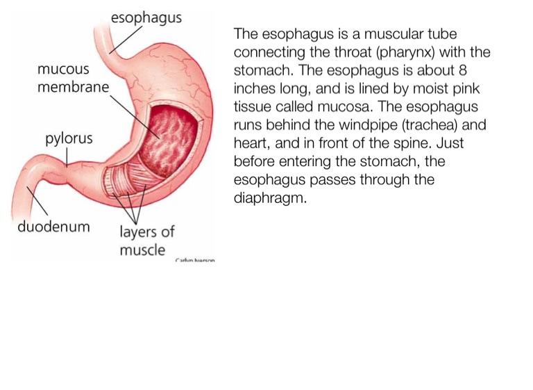 The esophagus is a muscular tube connecting the throat (pharynx) with the stomach. The esophagus is about 8 inches long, and is lined by moist pink tissue called mucosa. The esophagus runs behind the windpipe (trachea) and heart, and in front of the spine. Just before entering the stomach, the esophagus passes through the diaphragm.