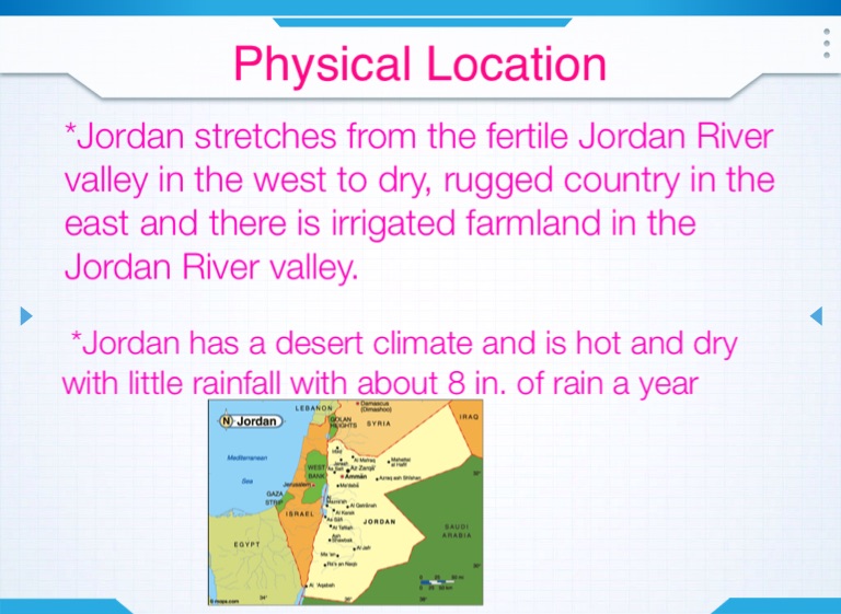 *Jordan stretches from the fertile Jordan River valley in the west to dry, rugged country in the east and there is irrigated farmland in the Jordan River valley.