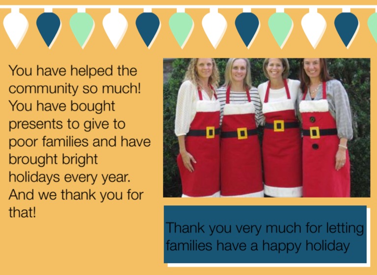You have helped the community so much! You have bought presents to give to poor families and have brought bright holidays every year. And we thank you for that!