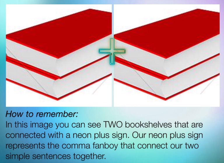 In this image you can see TWO bookshelves that are connected with a neon plus sign. Our neon plus sign represents the comma fanboy that connect our two simple sentences together.