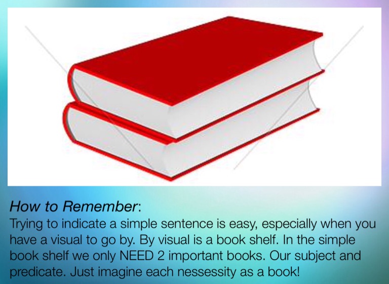 Trying to indicate a simple sentence is easy, especially when you have a visual to go by. By visual is a book shelf. In the simple book shelf we only NEED 2 important books. Our subject and predicate. Just imagine each nessessity as a book!
